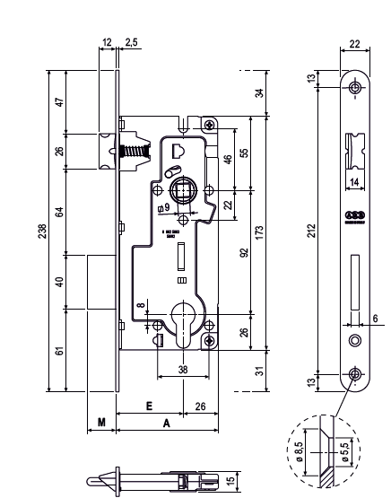 zadlabávací zámok DM50 • rozstup LM 92 mm • uzamykanie cylindrickou vložkou PZ • farba nikel • špičková kvalita