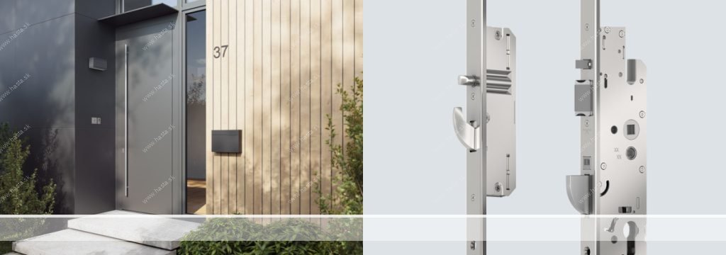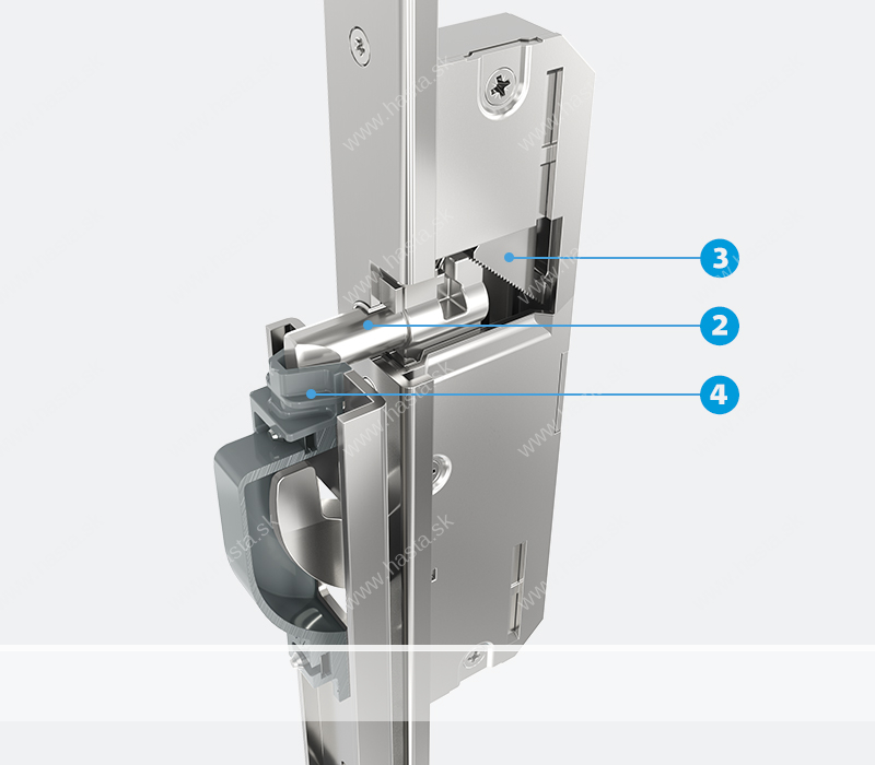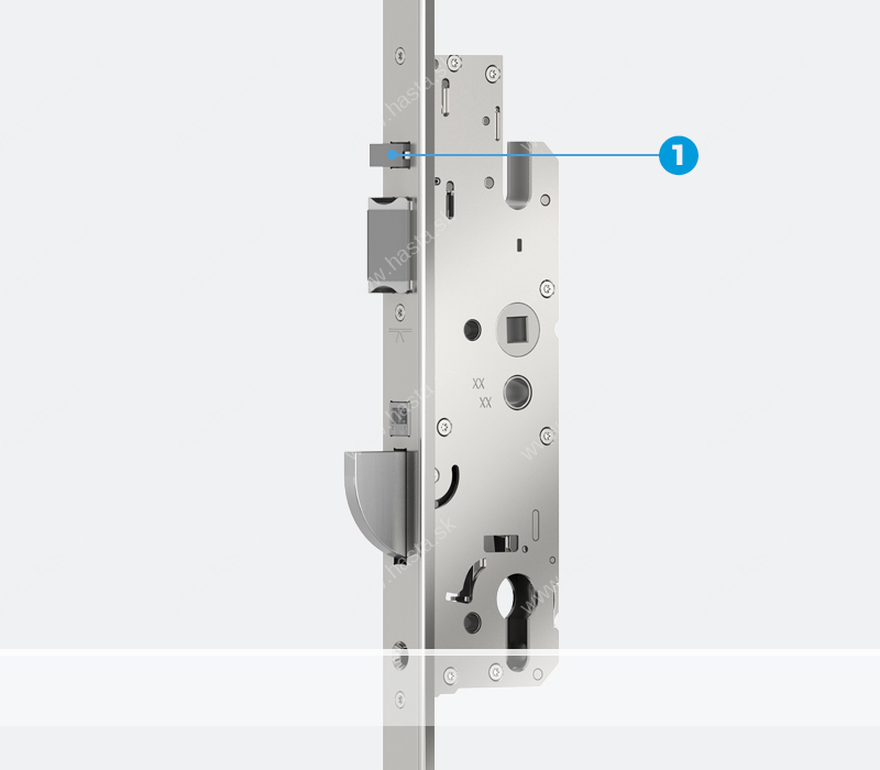 Aby sa dvere vždy spoľahlivo uzamkli, umiestnili sme do hlavného zámku automatickú uvoľňovaciu západku (1). To zaručuje vždy dokonalé uzavretie bez ohľadu na vôľu v drážke, aj keď je krídlo dverí ohnuté. Skutočné trojité uzamknutie zaisťuje automatické vysunutie otočných hákov o 20 mm a novo navrhnutá hlavná poistná závora – vďaka novej geometrii od veľkosti 35 mm dorn.