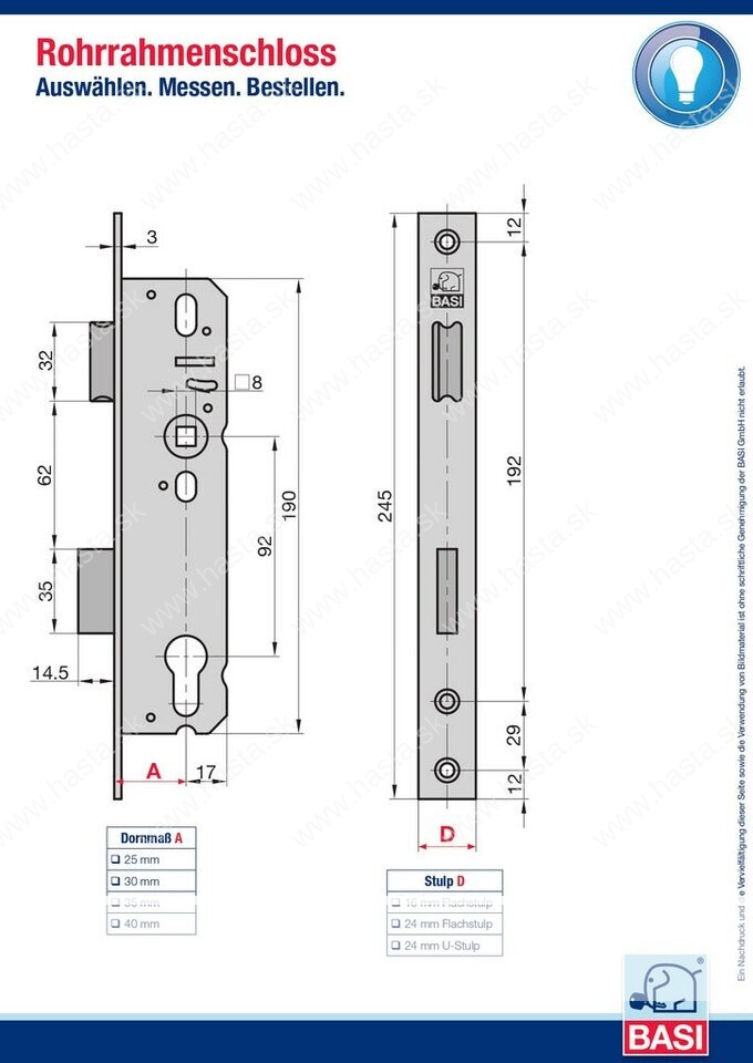 • Zámok BASI ES958 je k dispozícii v rôznych verziách a veľkostiach, takže je možné ho prispôsobiť rôznym typom dverí a požiadavkám zákazníka (napr. rôzne druhy vložiek, dĺžka, farba a pod.).